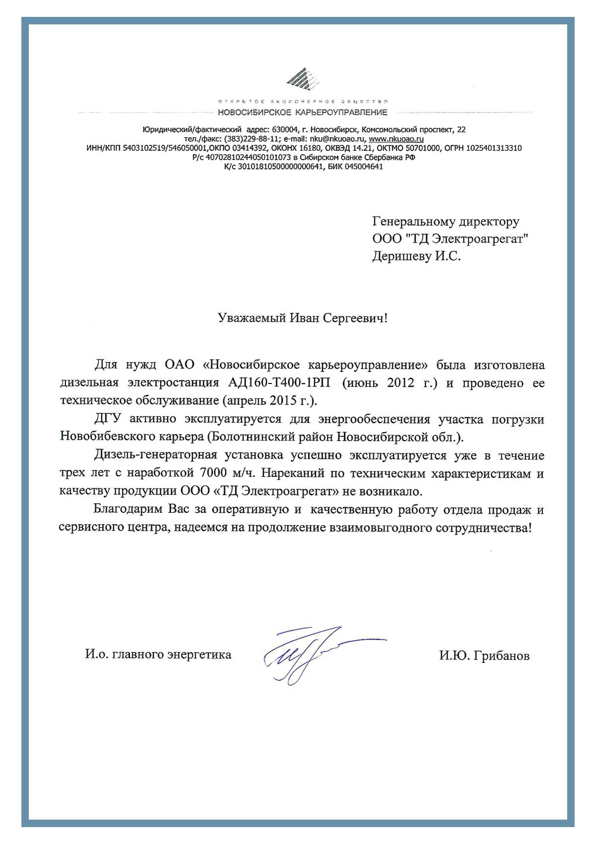 [ALT] => Отзыв контрагентов о компании ООО «ТД Электроагрегат» и исполненном проекте для ОАО "Новосибирское карьероуправление" г. Новосибирск