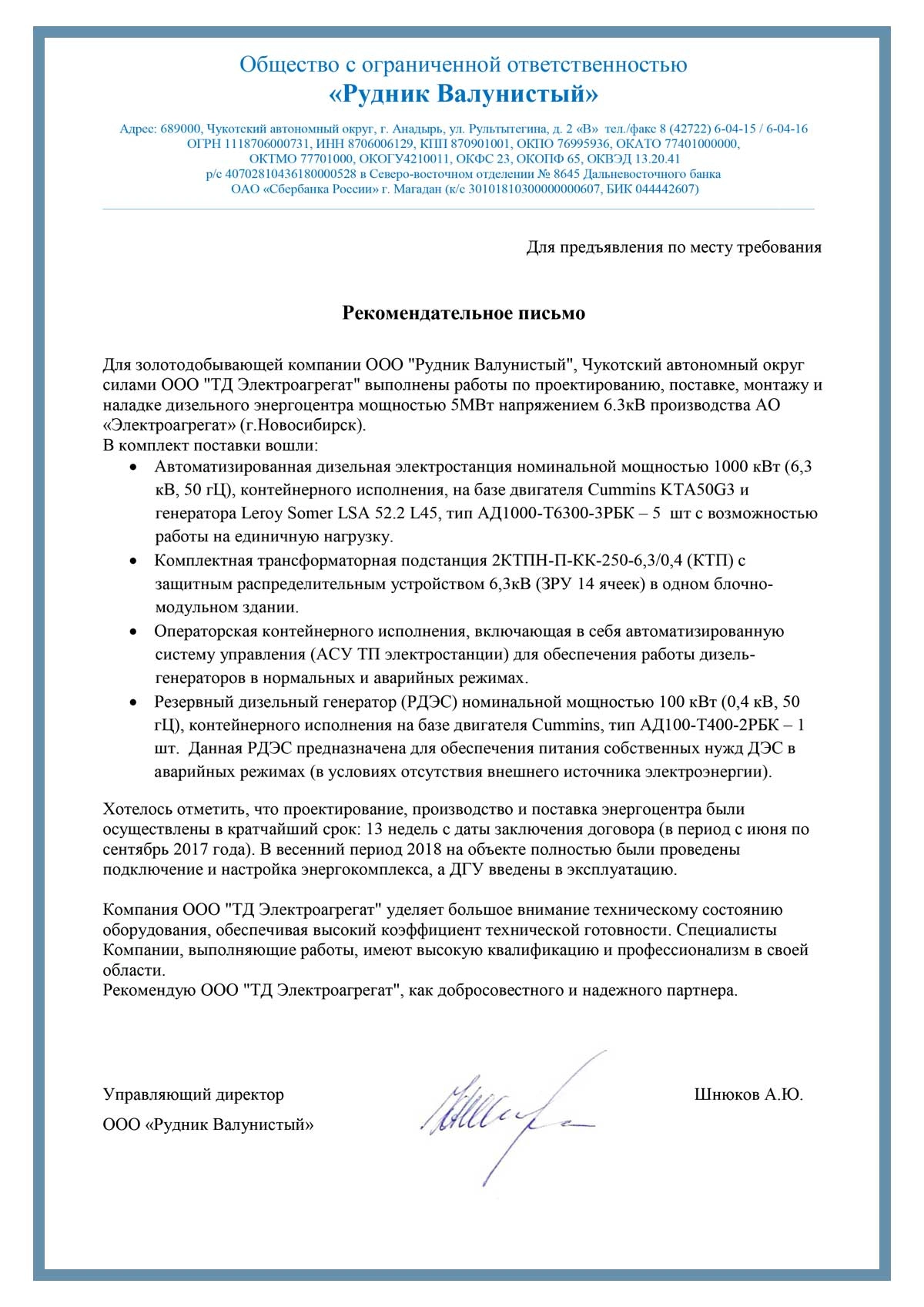 [ALT] => Отзыв контрагентов о компании ООО «ТД Электроагрегат» и исполненном проекте для ООО «Рудник Валунистый»